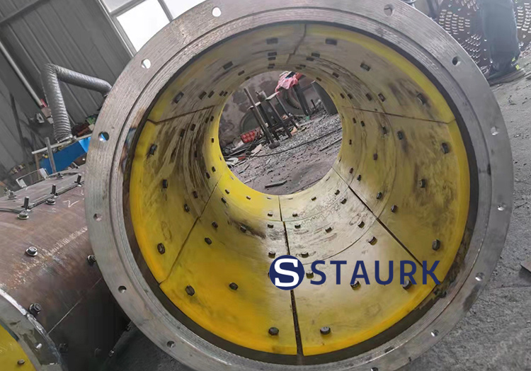 6)When installing a liner with a rubber backing plate, open the rolled rubber sheet 3 to 4 weeks before installation to allow it to stretch freely; when using a rubber sheet, the long side of the rubber sheet should follow the cylinder body Axial, the short side follows the circumference of the cylinder.